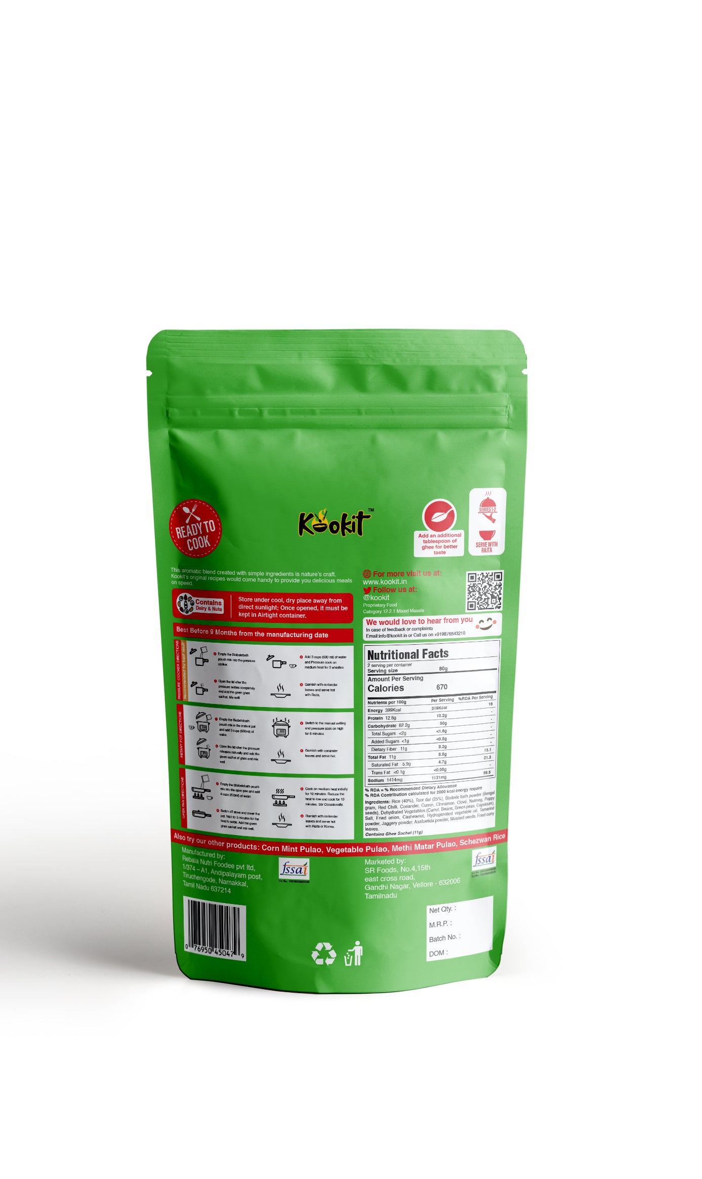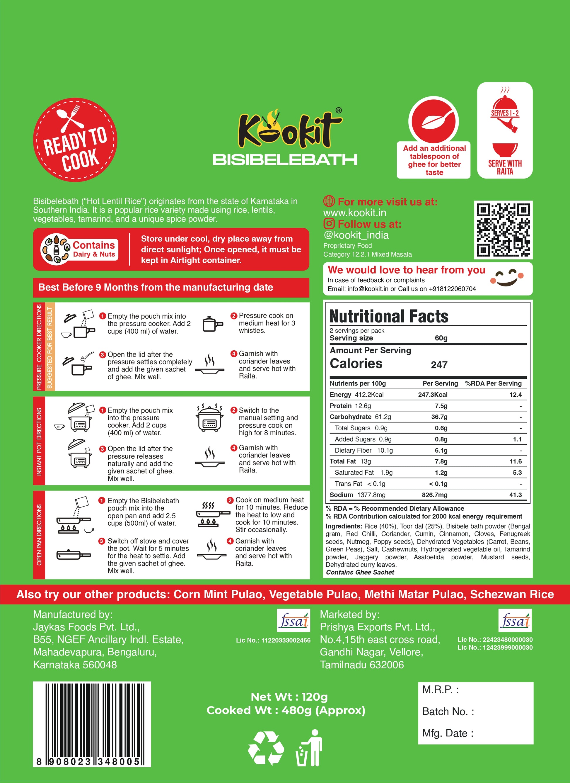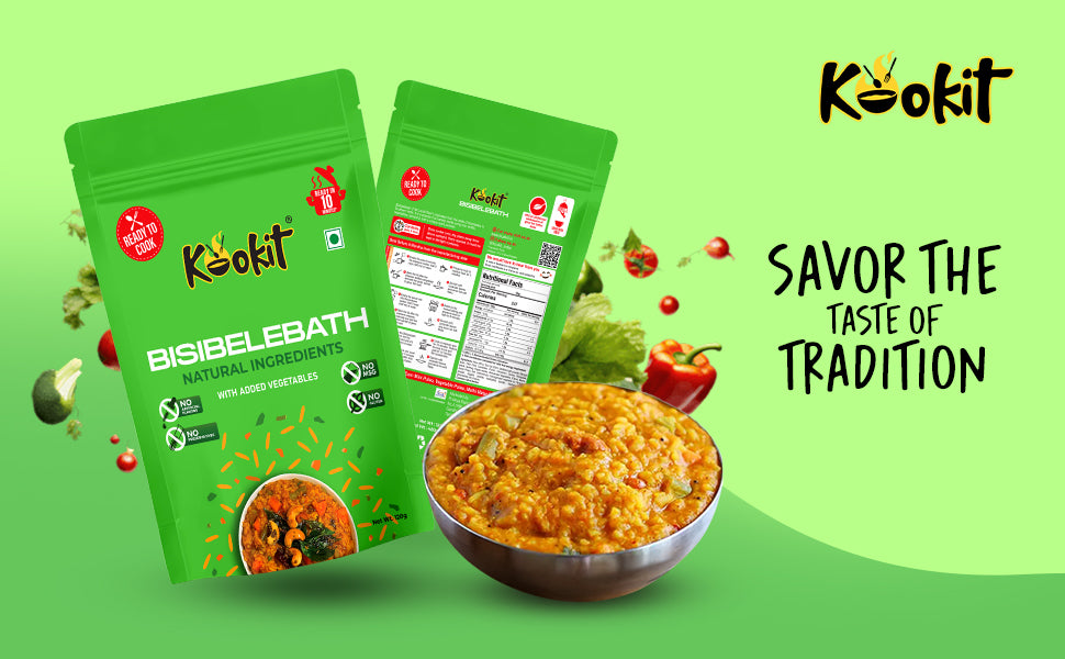 Bisibelebath is a traditional and beloved South Indian rice dish that tantalizes the taste buds with its rich and aromatic flavors. Translating to “hot lentil rice” in Kannada, the primary components of Bisibelebath include rice, lentils, assorted vegetables, and a unique blend of spices, creating a hearty and satisfying meal. What truly sets Bisibelebath apart is its unique spice blend, known as the Bisibelebath masala. This aromatic mixture typically includes ingredients like coriander seeds, fenugreek seeds, dry red chilies, cinnamon, cloves, and grated coconut, which are roasted and ground to perfection, infusing the dish with layers of complex flavor. Kookit brings the Authentic recipe of Bisibelebath right to your home while making it quick and simple to cook. Just empty the contents of the pouch, add water as per instructions and Kookit!