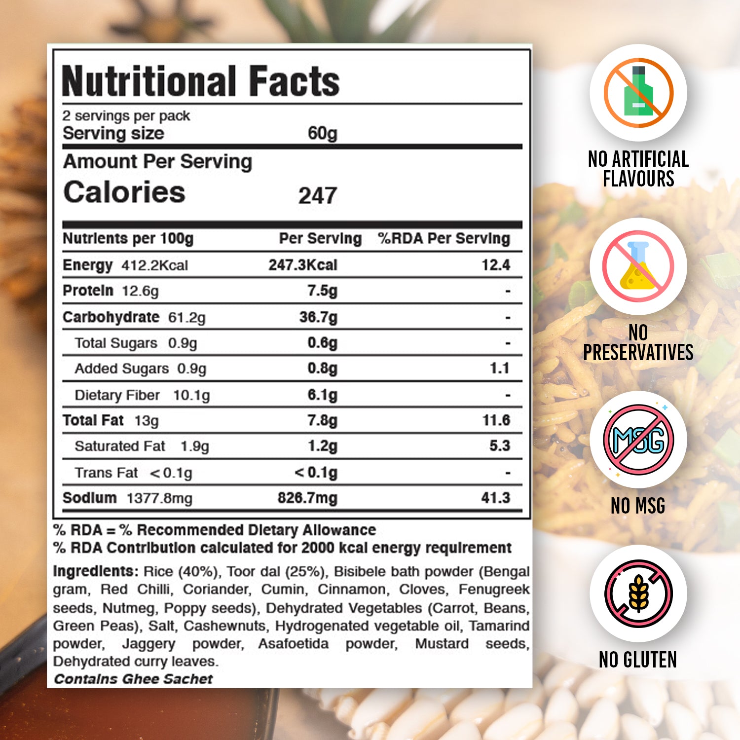 Premix of all ingredients which include Premium Rice grains, Vegetables (Beans, Carrots, Green Peas), Spices and Masala.
