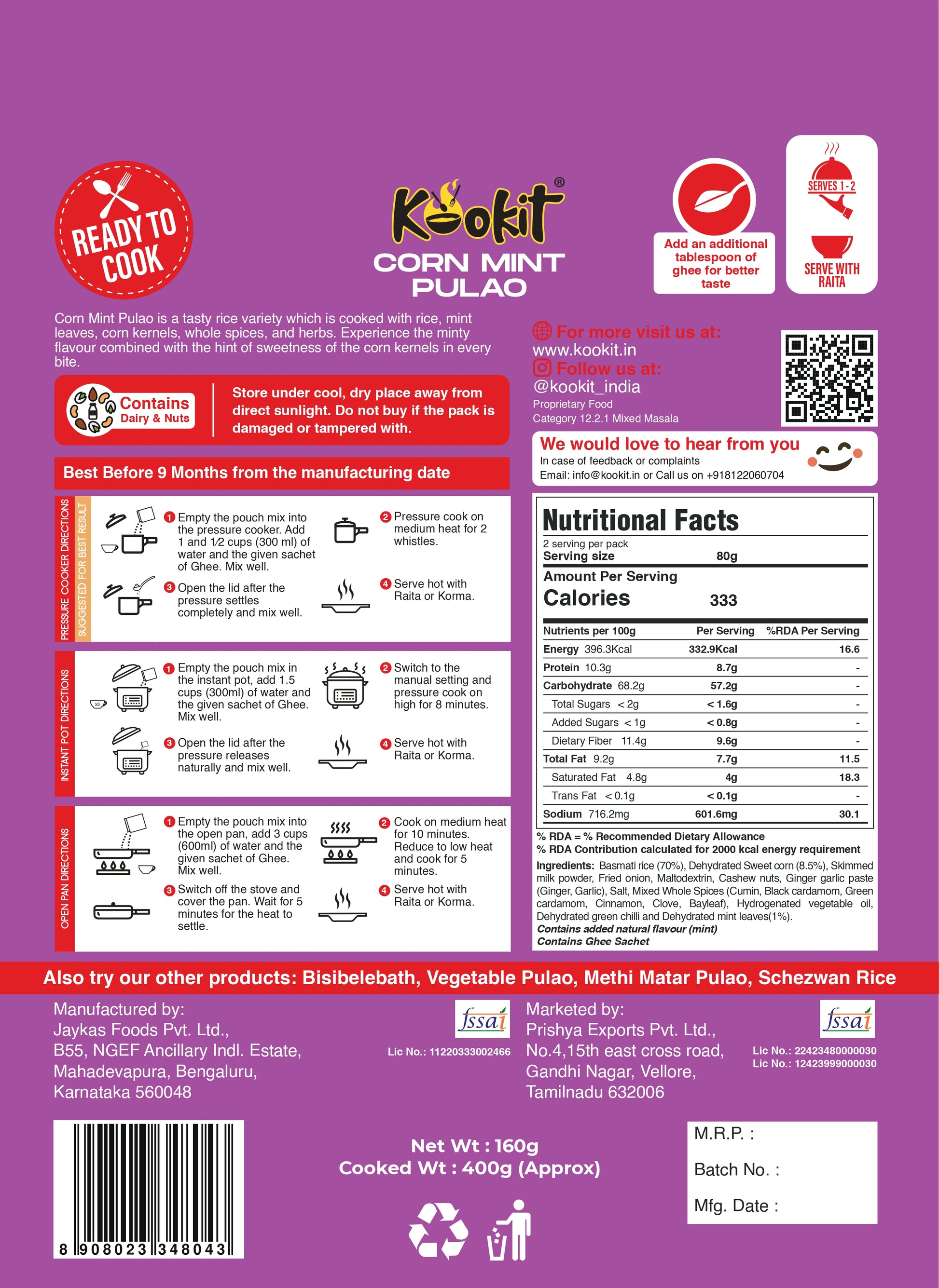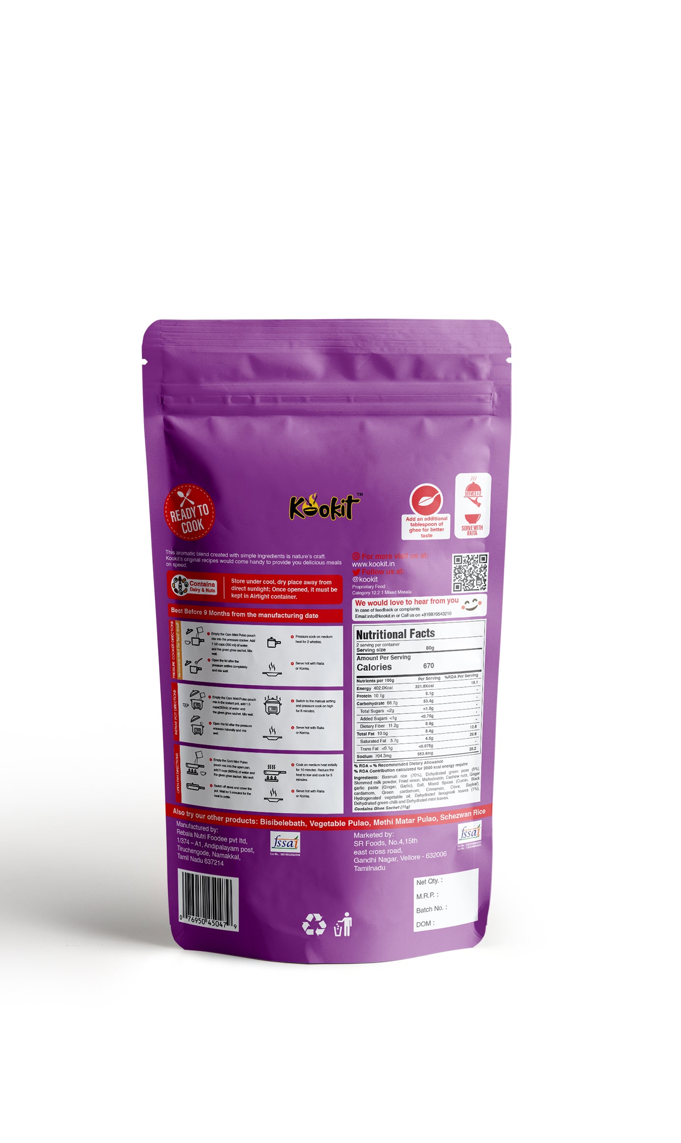 Corn mint pulao is a delectable rice dish that combines the sweetness of corn kernels with the refreshing flavor of mint leaves, creating a vibrant and aromatic culinary experience. The mint leaves, with their cool and invigorating taste, infuse the pulao with a refreshing zing, balancing the sweetness of the corn and the warmth of the spices with their vibrant flavor. Each spoonful is a tantalizing blend of textures and tastes, with the tender rice, plump corn kernels, and fragrant mint leaves coming together in perfect harmony. Kookit brings the traditional Corn Mint Pulao right to your home while making it quick and simple to cook. Just empty the contents of the pouch, add water as per instructions and Kookit!