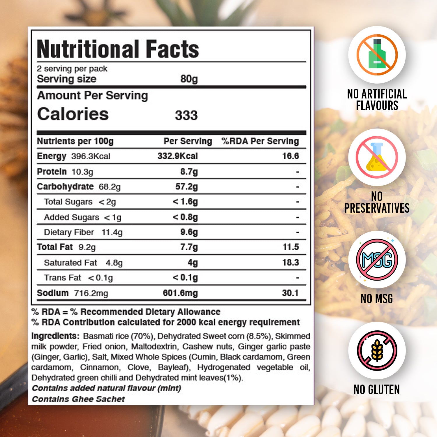 Premix of all ingredients which include Premium Basmati Rice, Sweet Corn, Mint Leaves, Spices and Masalas.