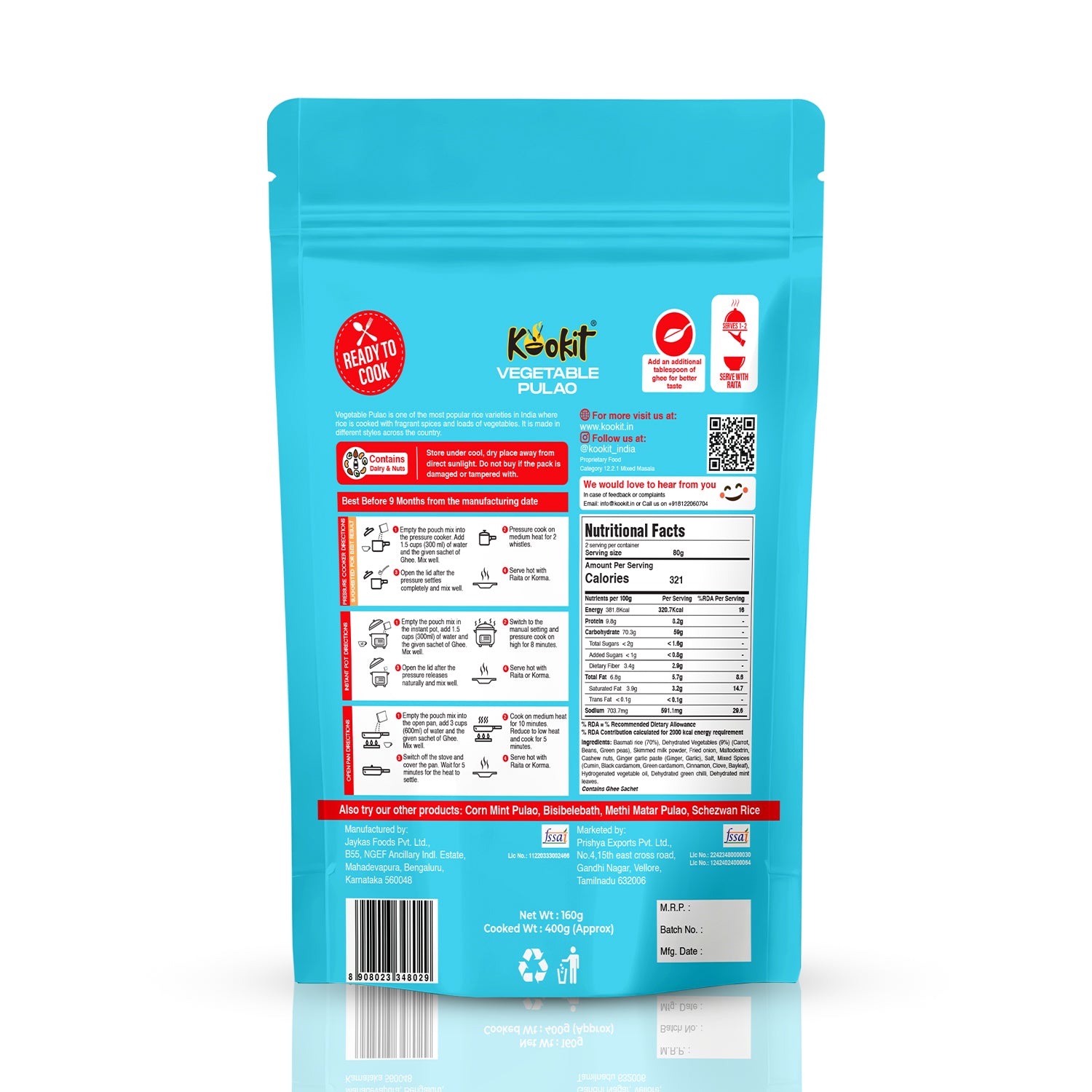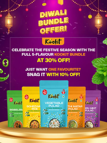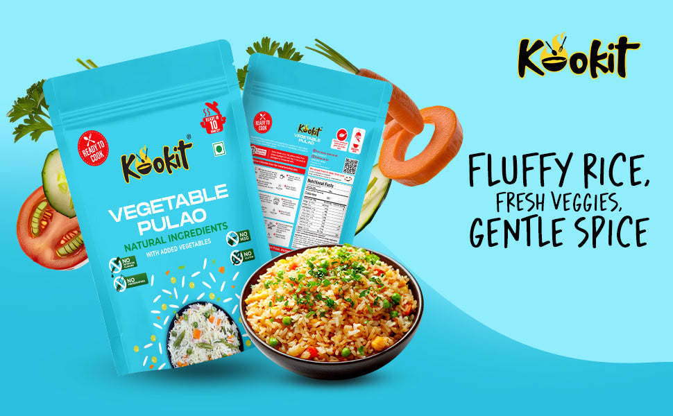 Vegetable pulao, also known as veg pulav or vegetable pilaf, is a fragrant and flavorful rice dish originating from the Indian subcontinent. It’s a one-pot dish made by cooking rice with a variety of vegetables, aromatic spices, and sometimes nuts or dried fruits. It is often served as a main course alongside yogurt, raita (a yogurt-based condiment), or a side of curry. It’s enjoyed in homes, restaurants, and at festive occasions due to its delicious taste and versatility. Additionally, it’s a favorite among vegetarians and vegans as a wholesome and nutritious meal option. Kookit brings the traditional Vegetable Pulao right to your home while making it quick and simple to cook. Just empty the contents of the pouch, add water as per instructions and Kookit!