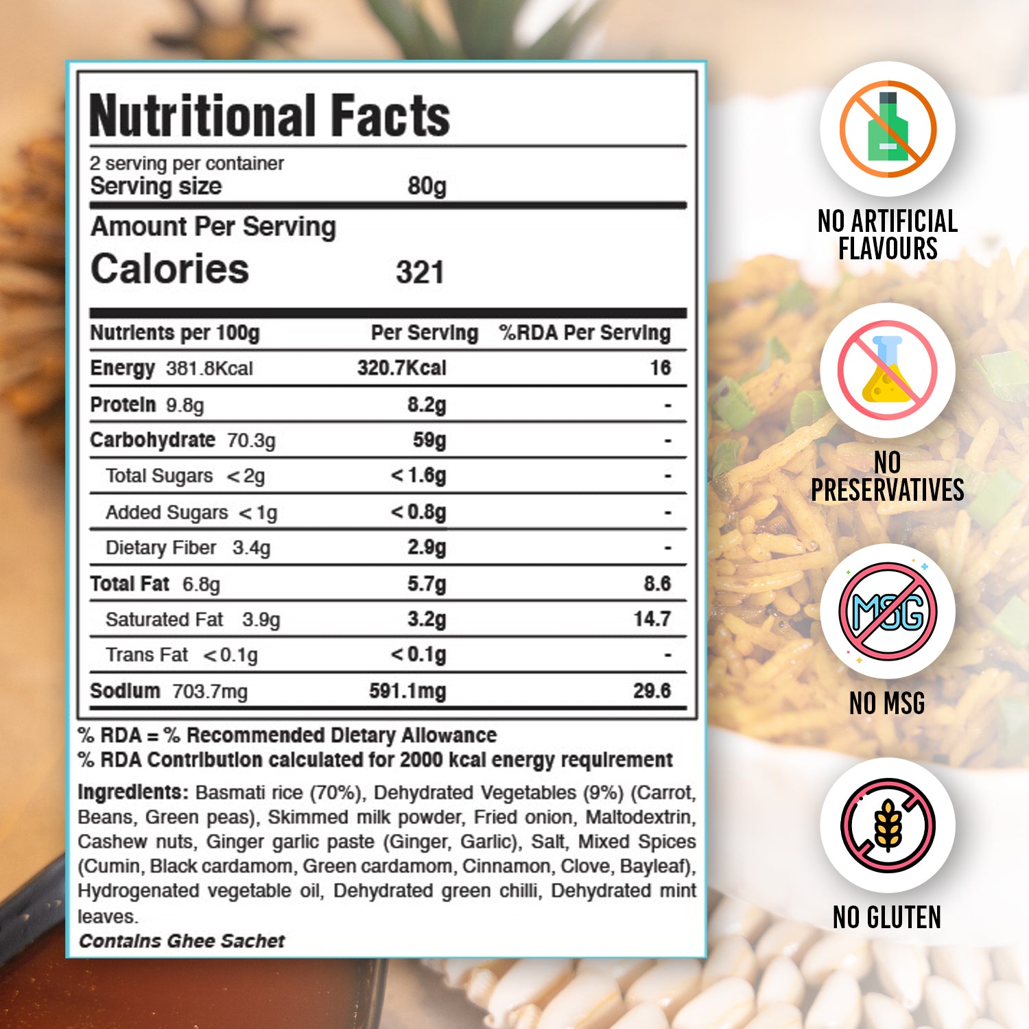 Premix of all ingredients which include Premium Basmati Rice, Vegetables (Beans, Carrots, Green Peas), Spices and Masalas